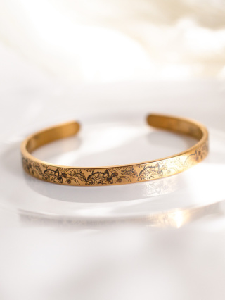 Każdy grawer, który pojawia się na bransoletce, wykonuję osobiście w mojej pracowni. To może być cytat, słowo mocy, symbol natury – coś, co rezonuje z Twoim sercem. Korzystam z techniki precyzyjnego, laserowego graweru, który pozwala na wykończenie z ogromną dokładnością. Do wyboru masz modele jednostronne lub dwustronne – z cytatem od wewnątrz i roślinnym motywem zewnętrznym (np. łąka, zioła, drobne gałązki). Dzięki temu biżuteria zyskuje głębię i osobisty charakter.